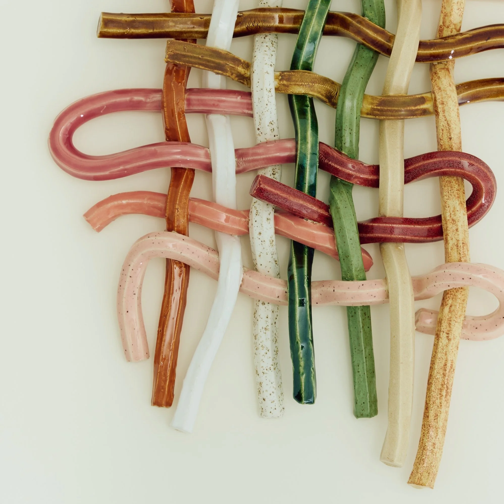 This collection, shown with The Dot Project, includes fabric collages, small tapestries, woven ceramics and a tile mural. Inspired by nature and drawings of ancient woodlands and rock formations, the works explore space, colour and texture. Ceramic weavings magnify soft gestures in clay, with looping threads and delicate, glazed strands.