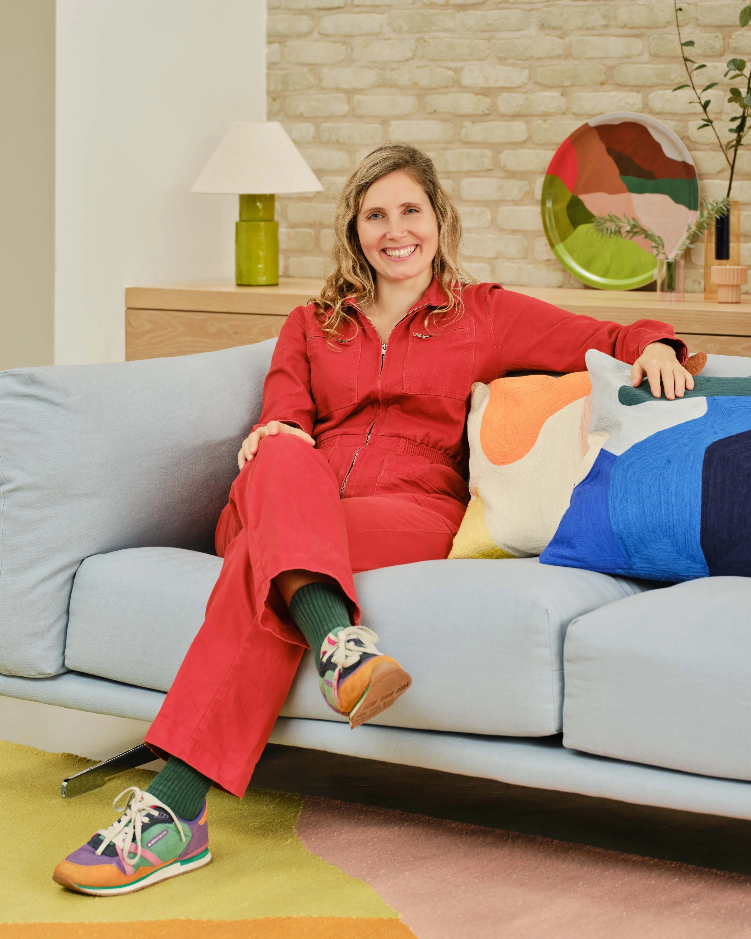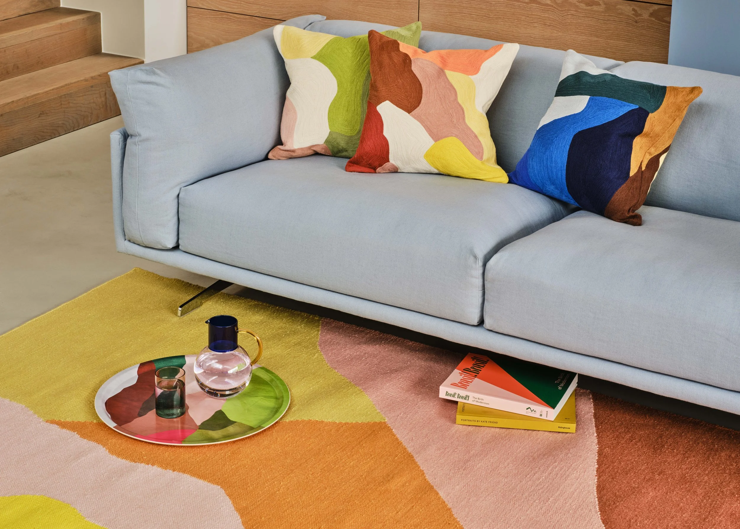 The pieces translate my studio practice into objects for everyday life, including cushions, a tray and a rug. The designs explore relationships between shape and colour, reflecting intangible feelings and memories, and organic patterns observed in nature.